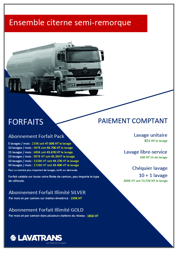 Tarifs conseillés du réseau LAVATRANS. Peuvent être différents selon les stations.